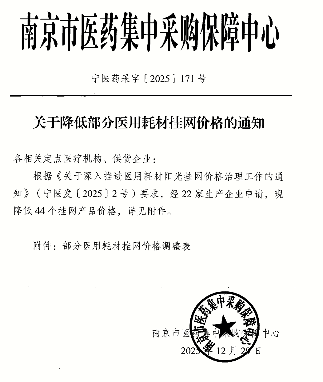 寧醫(yī)藥采字〔2025〕171號—關(guān)于降低部分醫(yī)用耗材掛網(wǎng)價格的通知